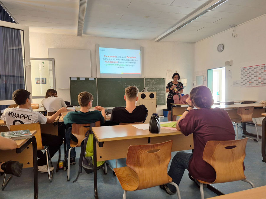 Vor Kurzem bekamen alle Klassen der Schule Besuch von Frau Stärk, die einen informativen Vortrag zum Thema Zahngesundheit hielt. Ziel war es, die Schülerinnen und Schüler für den richtigen Umgang mit ihren Zähnen zu sensibilisieren.
